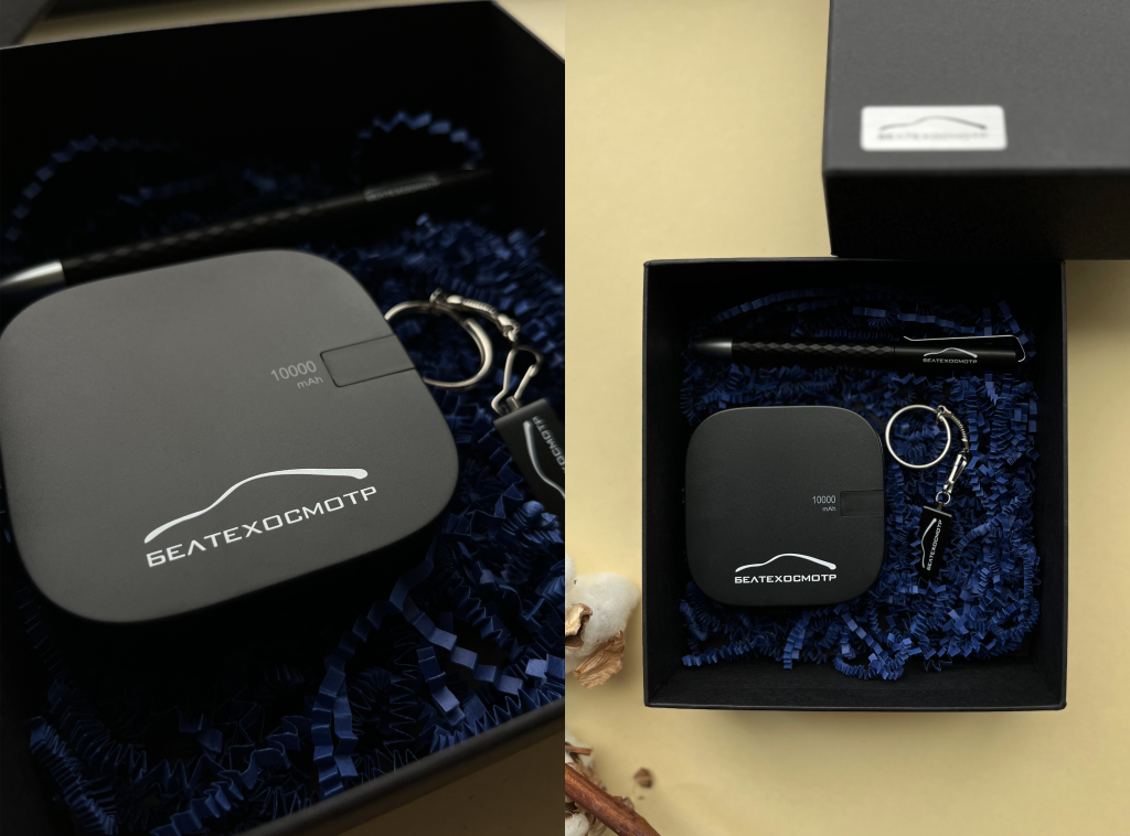 Также были собраны подарочные наборы под запрос клиента. В подарочную коробку были вложены power bank, ручка и флэшка. На все товары был нанесен логотип. Также была забрендирована и сама коробка: металлический шильд с гравировкой логотипа был размещен на крышке бокса.