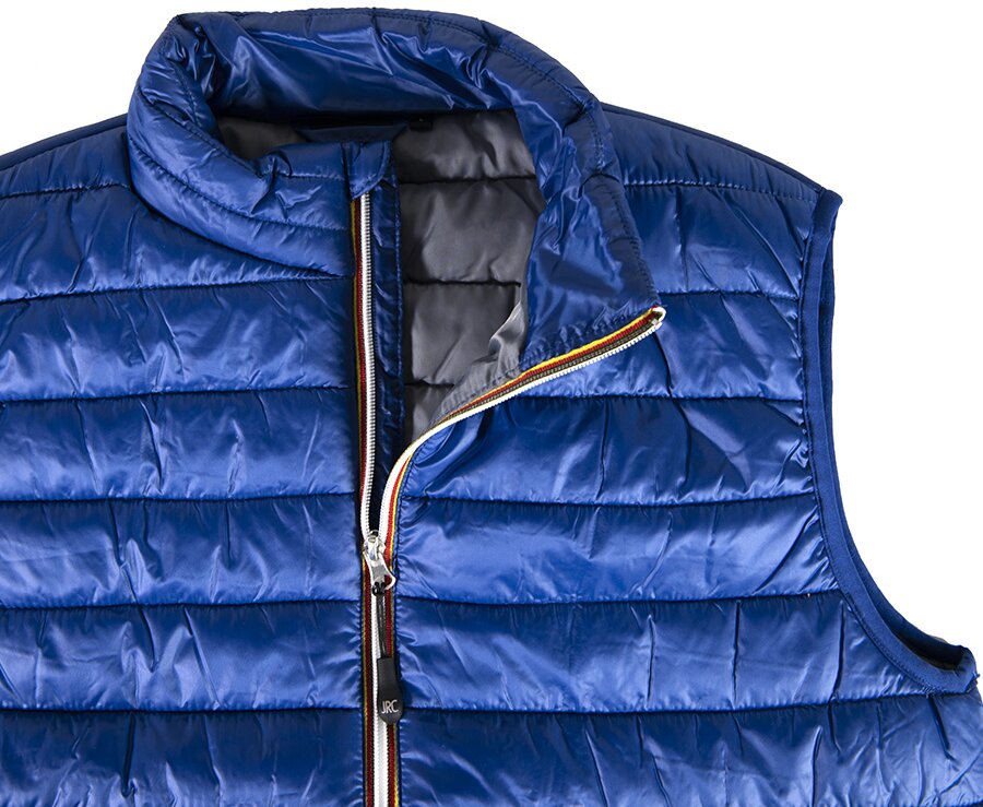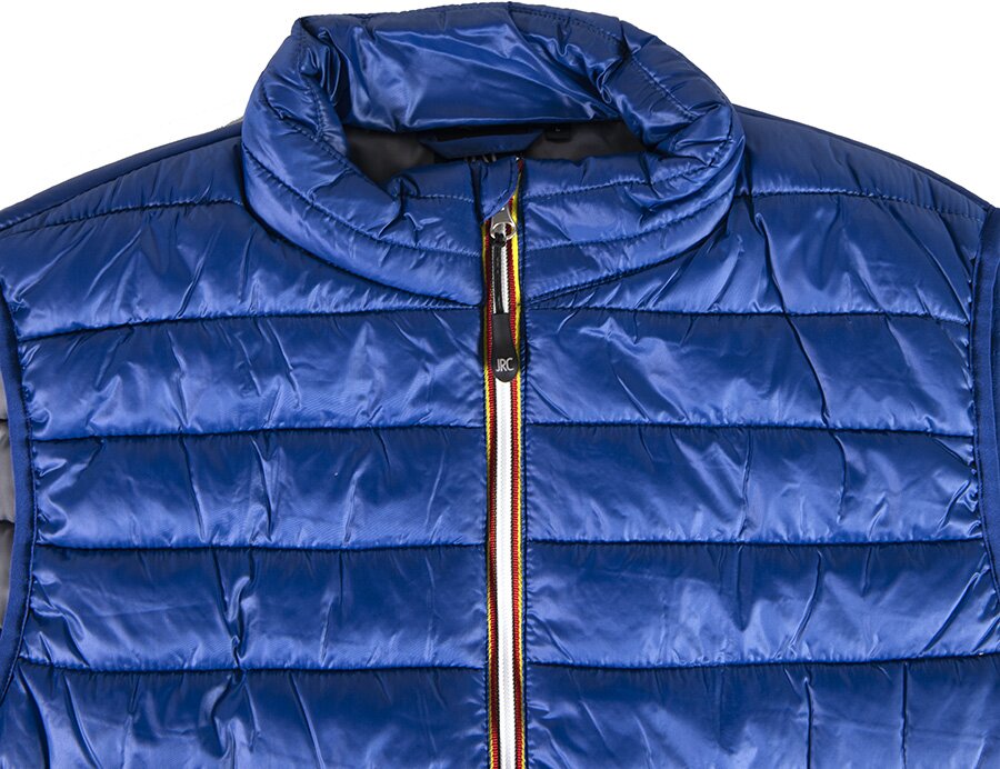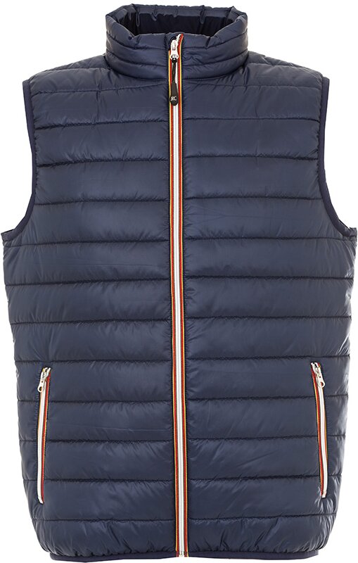 Легкий жилет из нейлона. Небольшой воротник-стойка. Контрастная облегленная пластиковая молния со съемным пуллером. Два передних кармана на молнии. Один внутренний карман на липучке. Cтягивающая эластичная резинка по низу изделия и в рукавах.