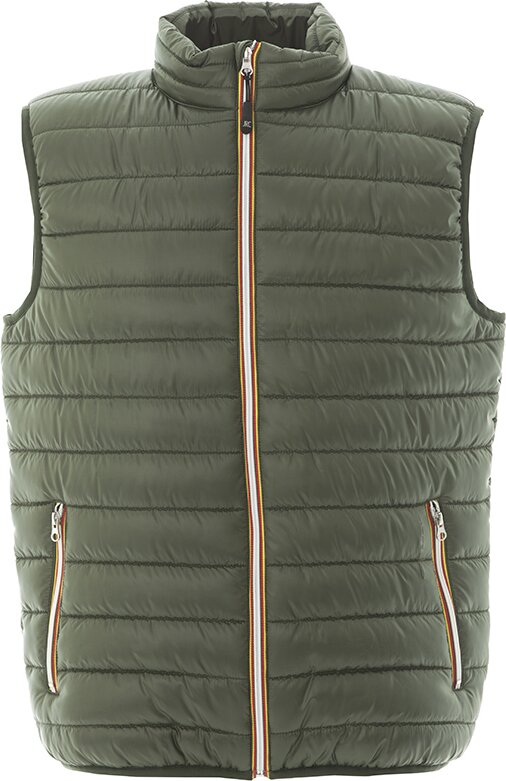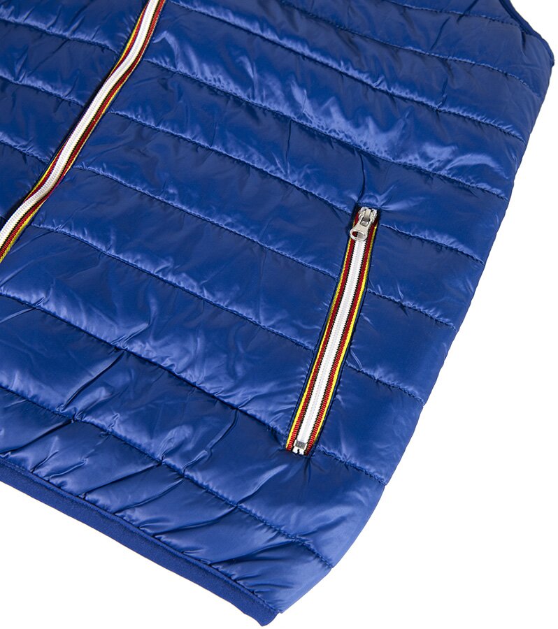 Легкий жилет из нейлона. Небольшой воротник-стойка. Контрастная облегленная пластиковая молния со съемным пуллером. Два передних кармана на молнии. Один внутренний карман на липучке. Cтягивающая эластичная резинка по низу изделия и в рукавах.