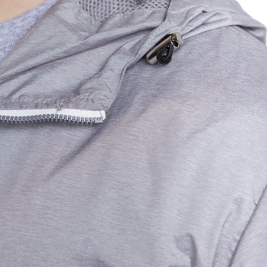 Ветровка водонепроницаемая из нейлона с «сеточкой». Два контрастных кармана на молнии и внутренний карман. Сетчатая подкладка с застежкой-молнией для легкой вышивки. Эластичная резинка по низу изделия и манжетах и регулируемые шнурки на капюшоне.