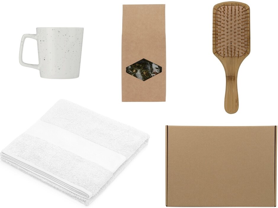 Полотенце из 100% хлопка обеспечит уют после ванны или душа. Полотенце имеет бордюр шириной 8 см. с одной стороны для нанесения логотипа (допускается незначительное отклонение по ширине). Массажная щетка для волос изготовлена из бамбука и имеет круглые и мягкие кончики, которые бережно расчесывают сухие и влажные волосы. Щетка хорошо массирует кожу головы, не травмируя ее, стимулирует кровообращение и, тем самым, улучшает рост и структуру волос. Успокаивающий травяной напиток с добавлением мяты и мелиссы скрасит любой вечер, сделает чаепитие уютным и умиротворяющим. Напиток обладает мягким успокаивающим действием, снимает стресс, расслабляет и помогает заснуть крепким сном. Кружка конусовидной формы выполнена из костяного фарфора - легкого и утонченного. Паттерн в виде брызг выделяет кружку из ряда других моделей, добавляя нотку небрежного шарма. - натуральные материалы; - размер полотенца 70±2 на 140±2 см; - кружка совместима с СВЧ-печами и посудомойками; - подарочная коробка уже в комплекте; - отличный под
